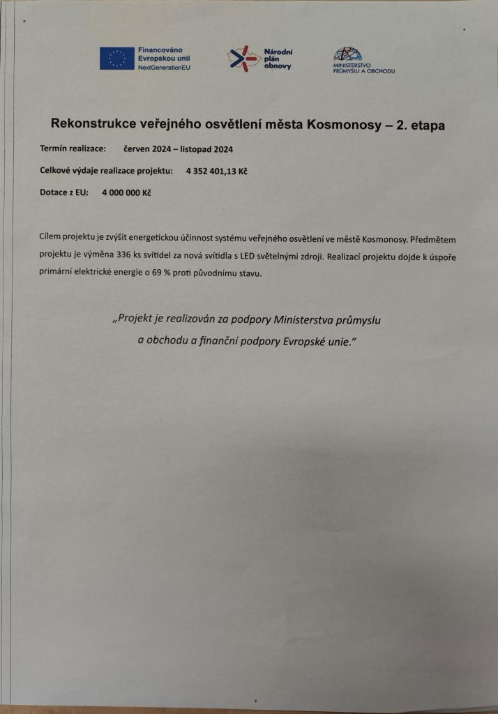 Město Kosmonosy obdrželo dotaci na 2.etapu výměny svítidel veřejného osvětlení za nová LED svítidla v úpočtu 336 svítidel