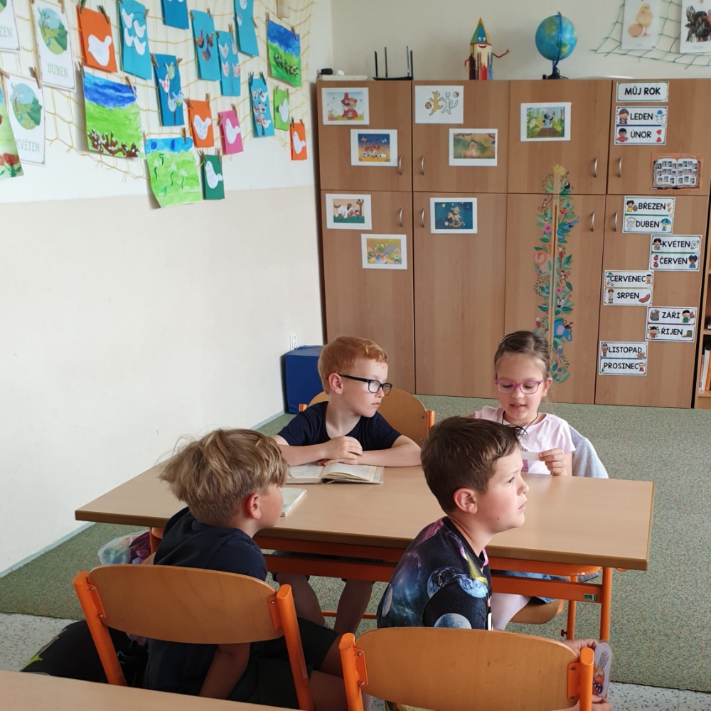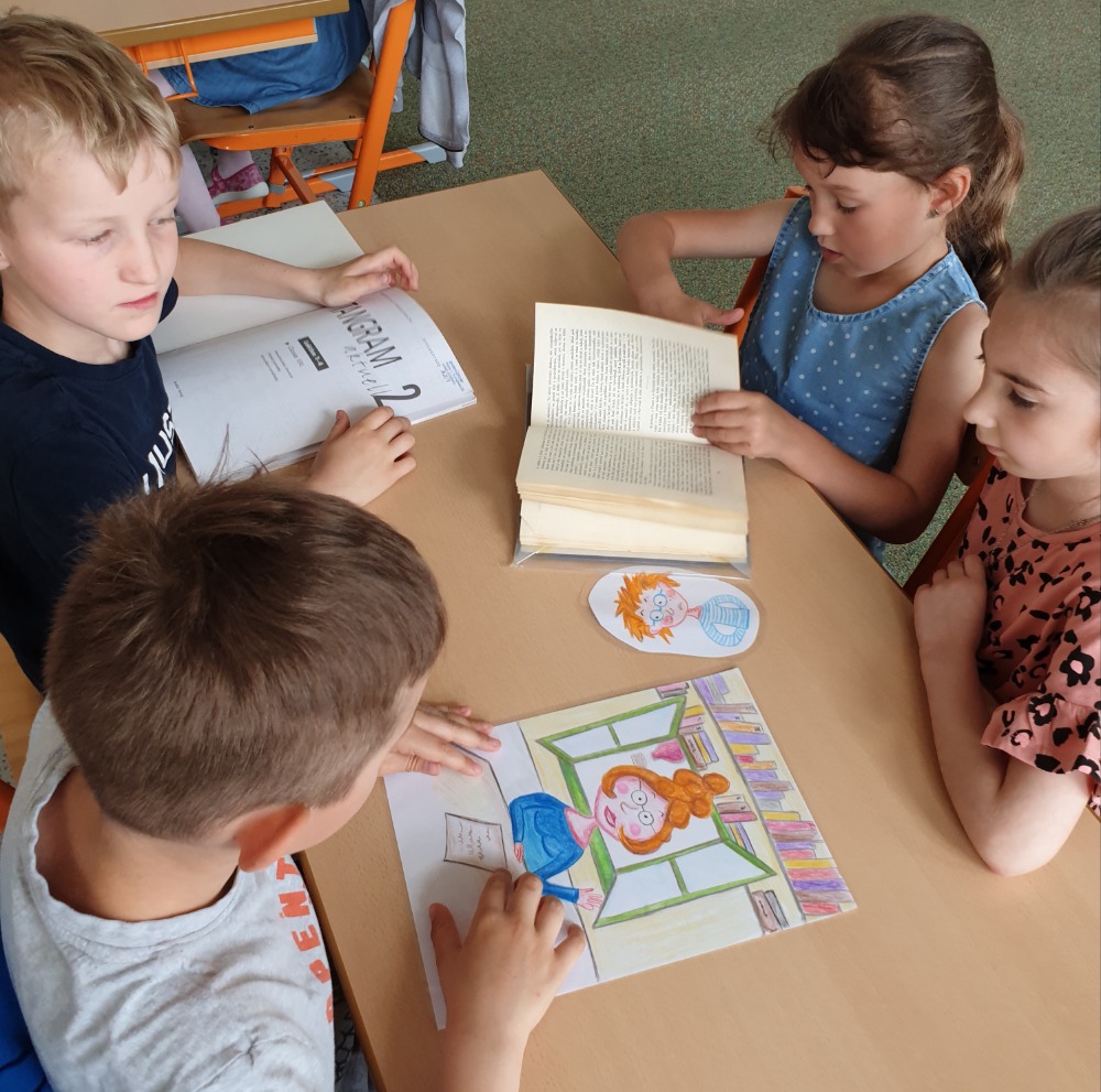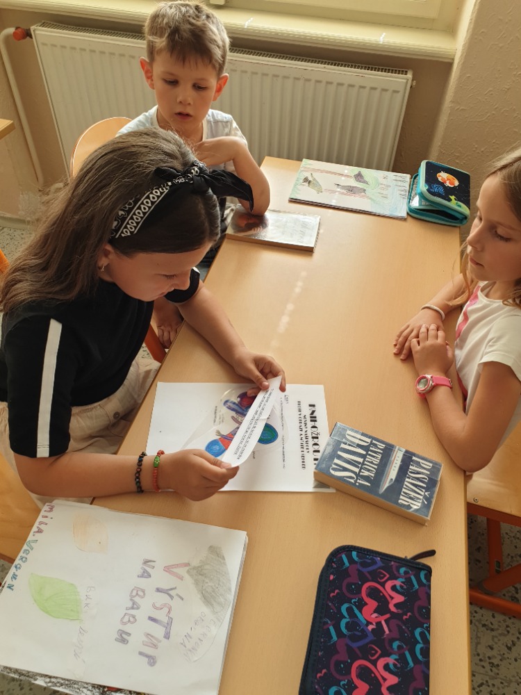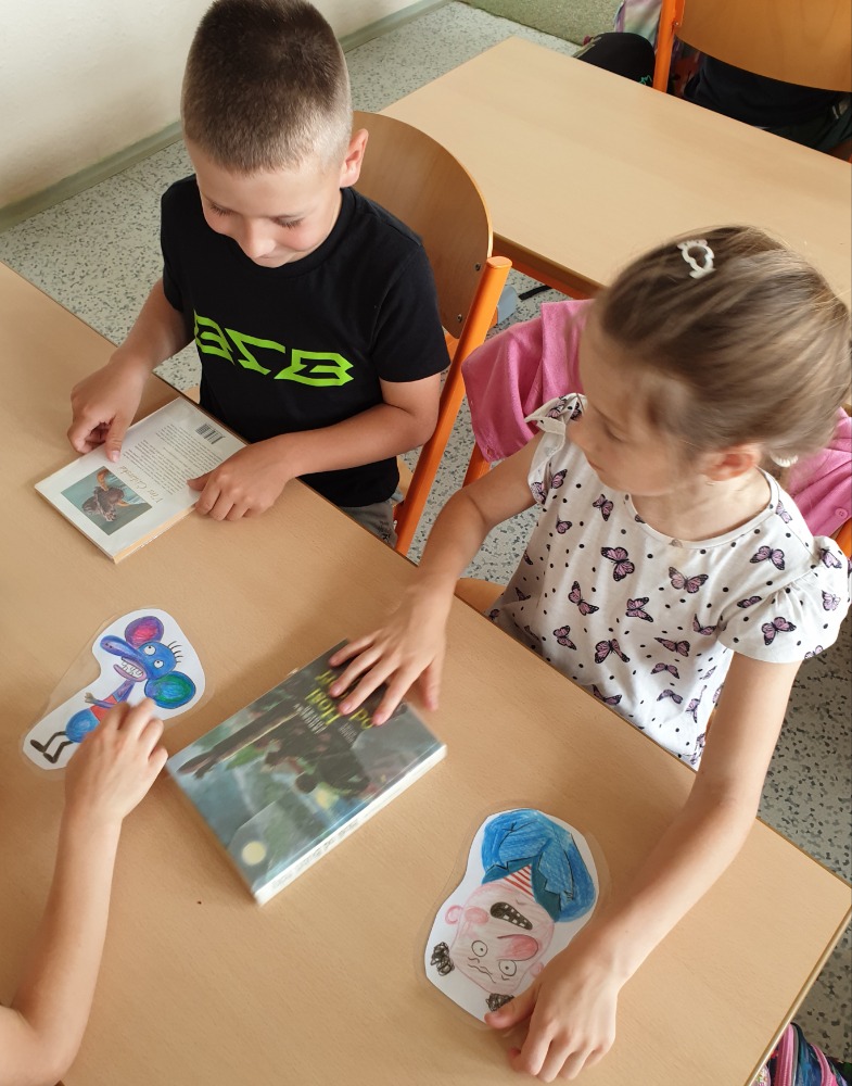 Má návštěva byla postavena trochu odlišně než většinou aktivity spojené s knihou bývají. Po zdolání několika stanovišť zaměřených na fyzickou kondici získali holky a kluci knihy. Ne ledajaké. Ukryla jsem do nich obrázky hlavních postav. Kdo jsou podivní skřítkové? Kdo paní s knihovnou za zády? Holčička s udiveným výrazem či střapatý kluk..?? Ale hlavně, kde je ztracená paní učitelka Snížková? Školní knihovna? Co se stalo? Spousta otázak…. A odpovědi? Ty ukrýval zvláštní výtisk novin. V jednotlivých článcích bylo možno získat potřebné informace k vyplnění úkolů. Jeden z nich byl nakreslit portrét paní učitelky Snížkové. Setkání bylo jako vždy plné dobré nálady. Děkuji dětem z 1. A a 1. B a jejich třídním Lence Eichlerové a Janě Kronusové.